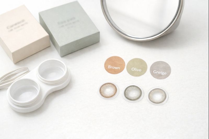 まず色は肌や髪色になじみやすい系統を選ぶのが鉄板です。ブラウンは血色感が出て失敗しにくく、仕事でも浮きにくい万能色です。オリーブやグレージュは透明感を出しやすい一方で、高発色に振れると浮きやすいので、トーンが落ち着いたものを選ぶのがコツです。迷ったら、暗髪はブラウン〜グレージュ、明るめの髪はブラウン〜オリーブ寄りにすると統一感が出ます。