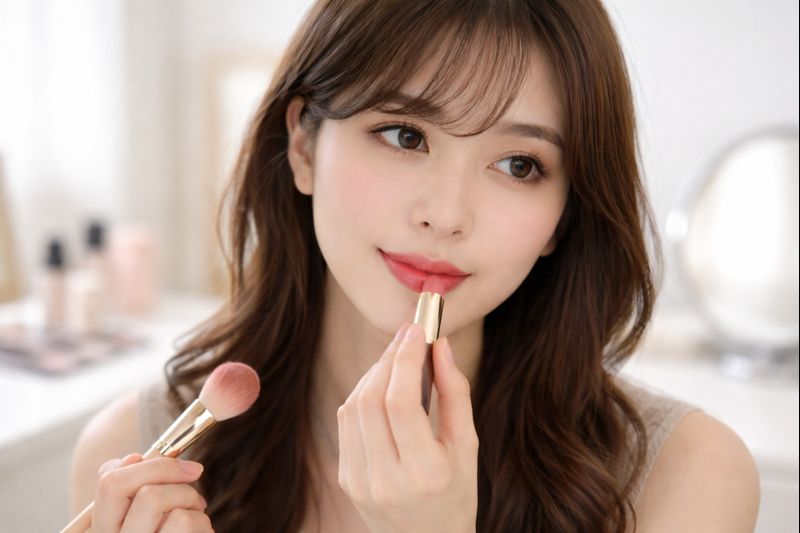 カラコンが浮く人は、目元に比べて口元や頬の血色が弱いことが多いです。目だけが主張すると顔色が沈んで見え、違和感が強まります。リップはくすみピンクやベージュローズなど、肌になじむ色で血色を足すとバランスが取れます。チークも薄く入れて、顔全体に温度感を出すと、カラコンの発色が自然に馴染みやすくなります。