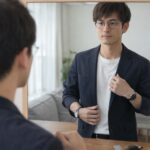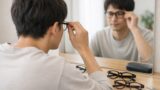顔型に合うツーブリッジを鏡の前で試着して印象を確認する日本人の様子 伊達メガネ・ファッション