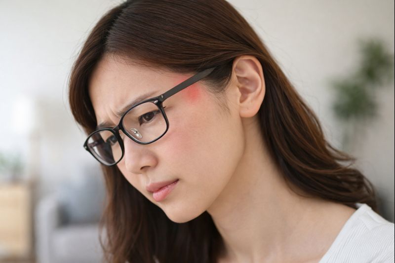 跡が残ったときは、強く揉むよりも、温めて血行を戻すほうが落ち着きやすいです。蒸しタオルを短時間当てる、入浴で温めるなど、負担の少ない方法を選んでください。毎日跡が濃い場合は、肌ケアだけでなくフィット自体が合っていない可能性が高いので、眼鏡店で「こめかみに跡が残る」と伝えて調整してもらうのが確実です。